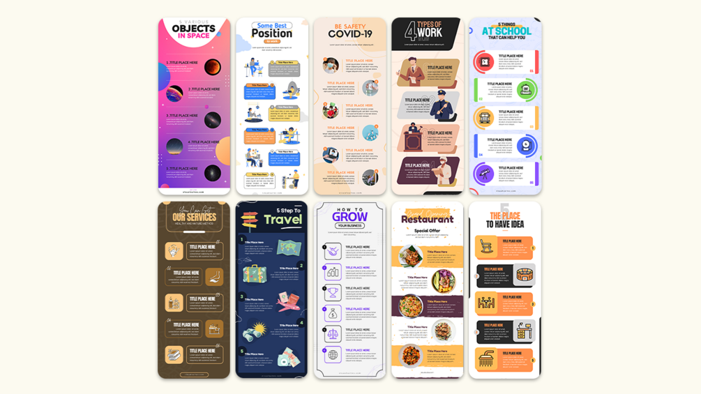 Get your 120 Infographics Canva template, with a creative and compelling design. It includes anything you need to fastly create any feeds infographic content for your business. You can edit all aspects of the template and adapt it to your specific needs. You can replace elements, change fonts, images and everything else that might be necessary for you to create a unique infographic content.