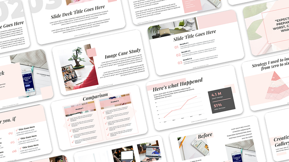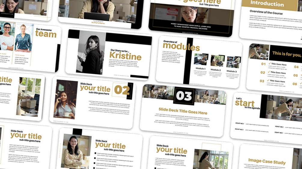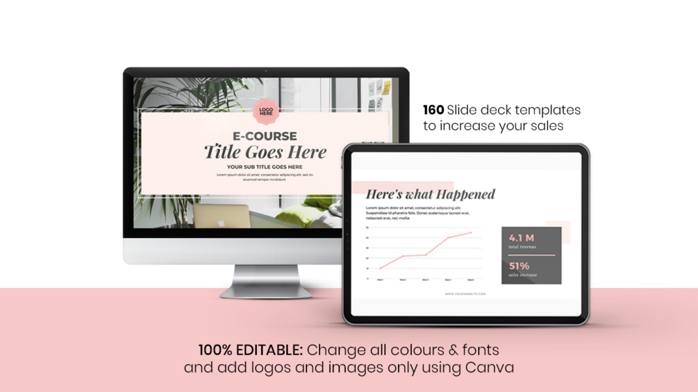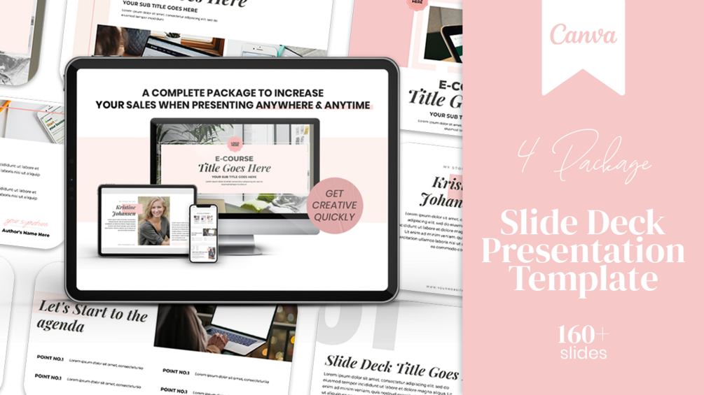 Get your 4 Package Slide Deck Canva presentation template, with a creative and compelling design. It includes 160+ slides that will enable you to create a presentation that will work perfectly for your business. You can edit all aspects of the template and adapt it to your specific needs. You can remove slides, replace elements, change fonts, images and everything else that might be necessary for you to create a unique presentation.