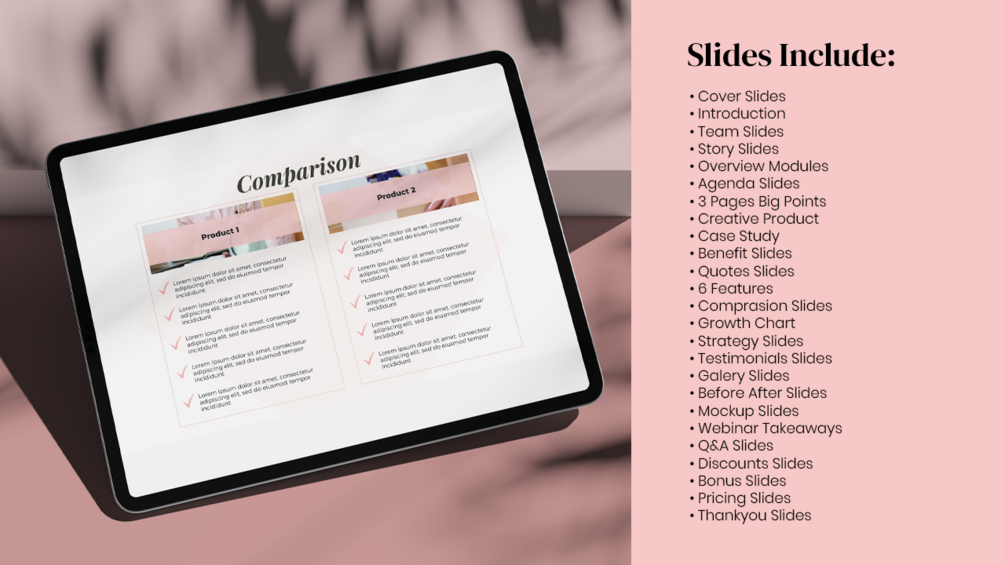 The pack includes cover slides, introduction, team slides, charts, diagrams, story slides, case study slides and a lot more. All the slides flow perfectly and will give your presentation a creative advantage over other templates.